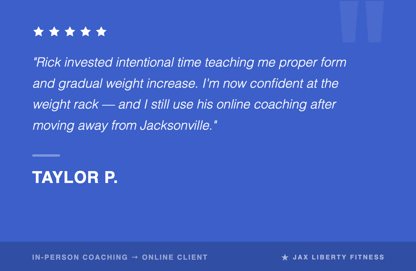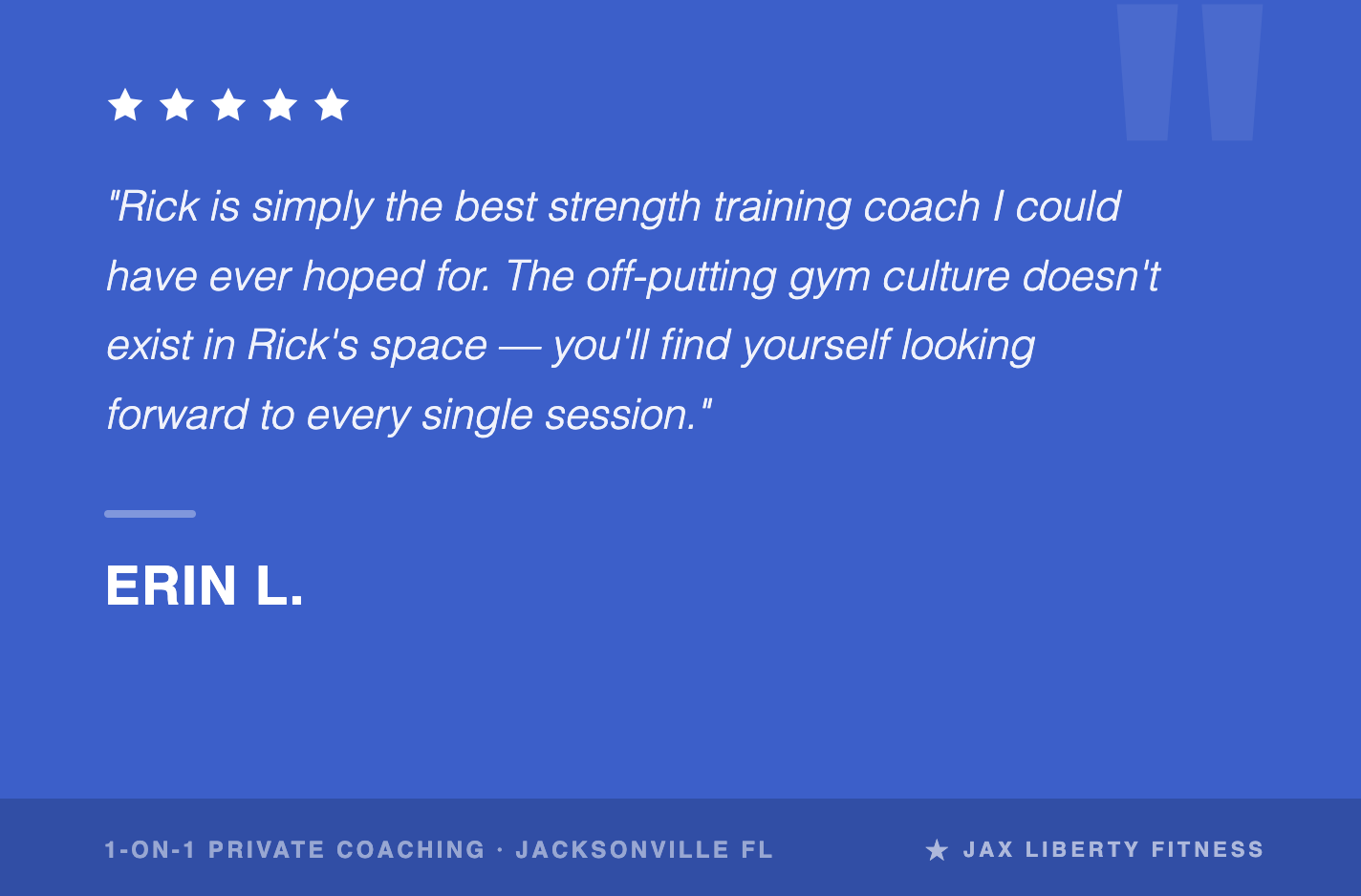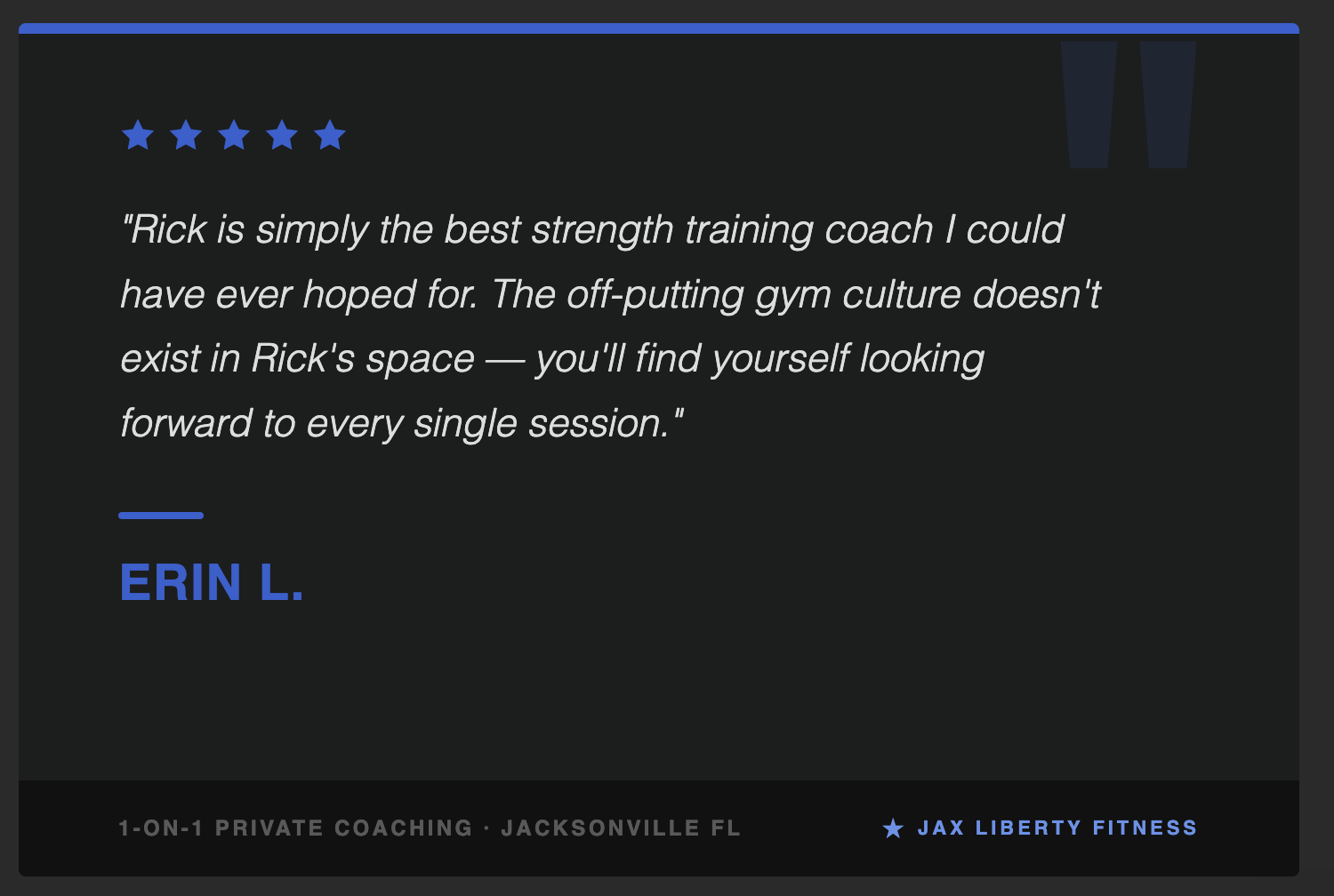 Every client at Jax Liberty Fitness trains on a program written specifically for them. Rick writes it, loads the bar, watches every rep, and coaches your technique while you're lifting — not after. Between sessions, your program lives in TrueCoach. Rick sees your numbers, updates your programming, and is one message away.